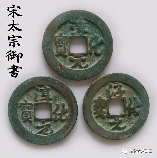 “淳化元宝”:宋太宗淳化六年(公元990年) 铸, 由宋太宗亲书钱文,分真、行、草三体,皆顺读,钱径2.4厘米,穿径0. 7厘米。淳化元宝价值极高,因为其上图案雕刻精美,背面神态逼真的两尊佛像。钱文为所谓的“御书体”,分楷书、行书、草书三种体,楷书浑厚端庄,行书隽永流连,草书奔放流畅。而楷体一种的“元宝”二字仍然属于“隶书”。宋太宗一生酷爱书法,行书“淳化元宝”四字,笔法隽永流连,十分洒脱。这种佛像金钱以造型独特、雕刻细腻、图案精美和花纹精细,而特有魅力。
