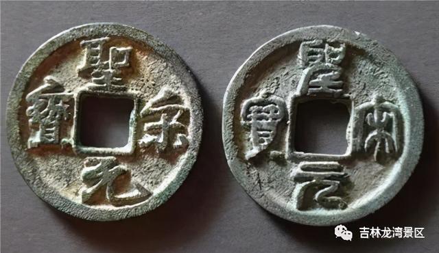 “圣宋元宝”:宋徽宗建中靖国元年(公元1101年)铸,钱文分篆、行两种,钱径分3和2.5厘米两种。