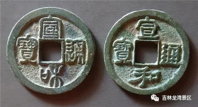 “宣和通宝”:宋徽宗宣和元年(公元1119年)铸,钱文分篆、楷两种,对读,钱径3厘米,穿径0.8厘米。