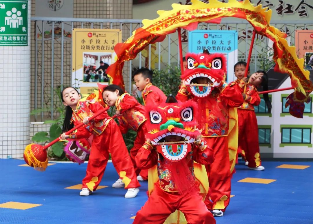 在广东省广州市天河区珠江新城猎德幼儿园安全第一课情景剧《走失我不怕》中,幼儿表演舞龙舞狮。(广州市教育局供图)