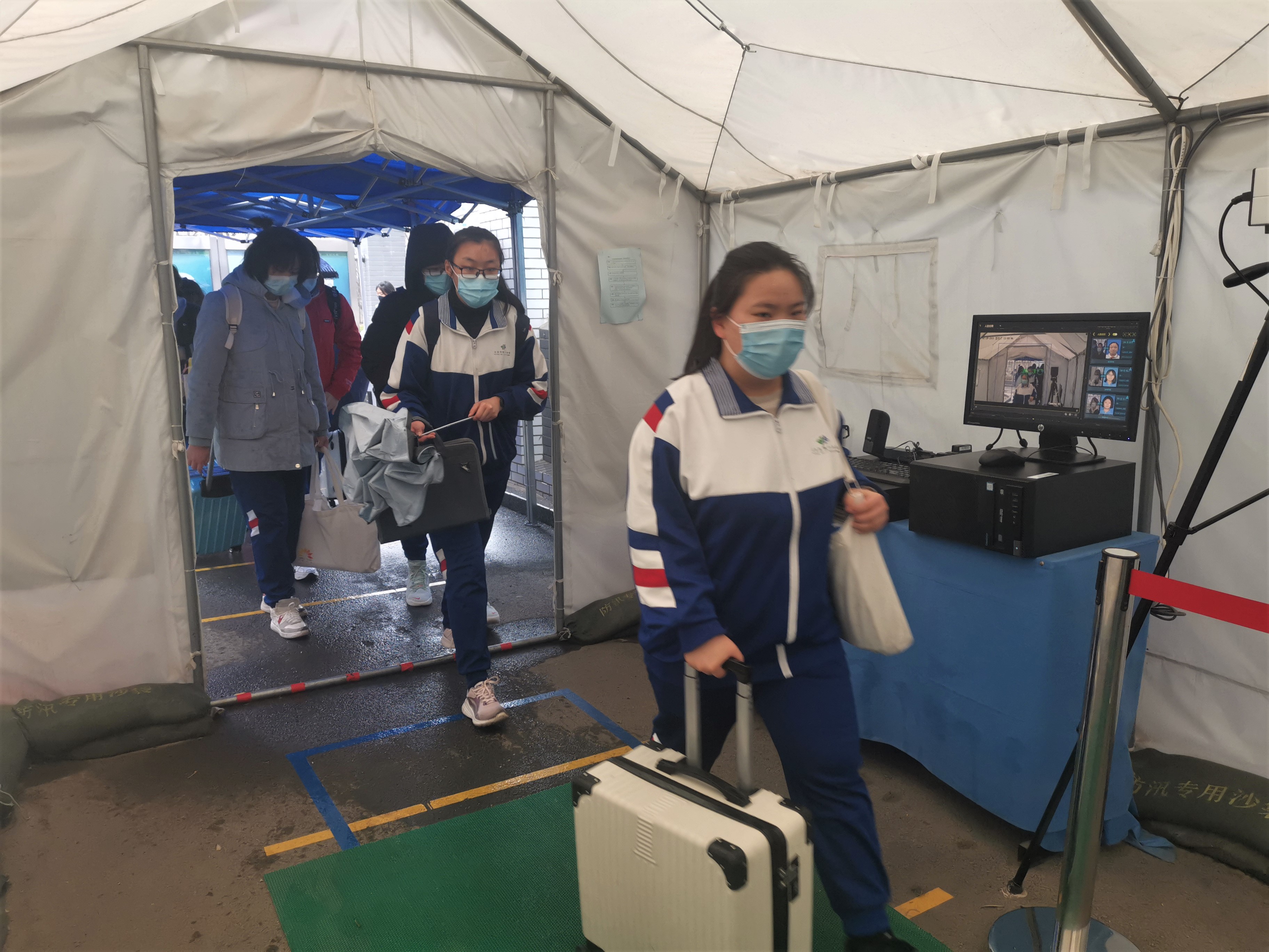 在北京市第十一中学门前,住宿生等部分同学已开始返校。校园内的地面上贴上了黄色的一米线标识,学生在标识的引导下通过体温检测处。经过检测设备时,电脑屏幕上都会显示体温、学生姓名、是否戴口罩等信息,桌子上还备有消毒湿巾、口罩、体温计等物资。