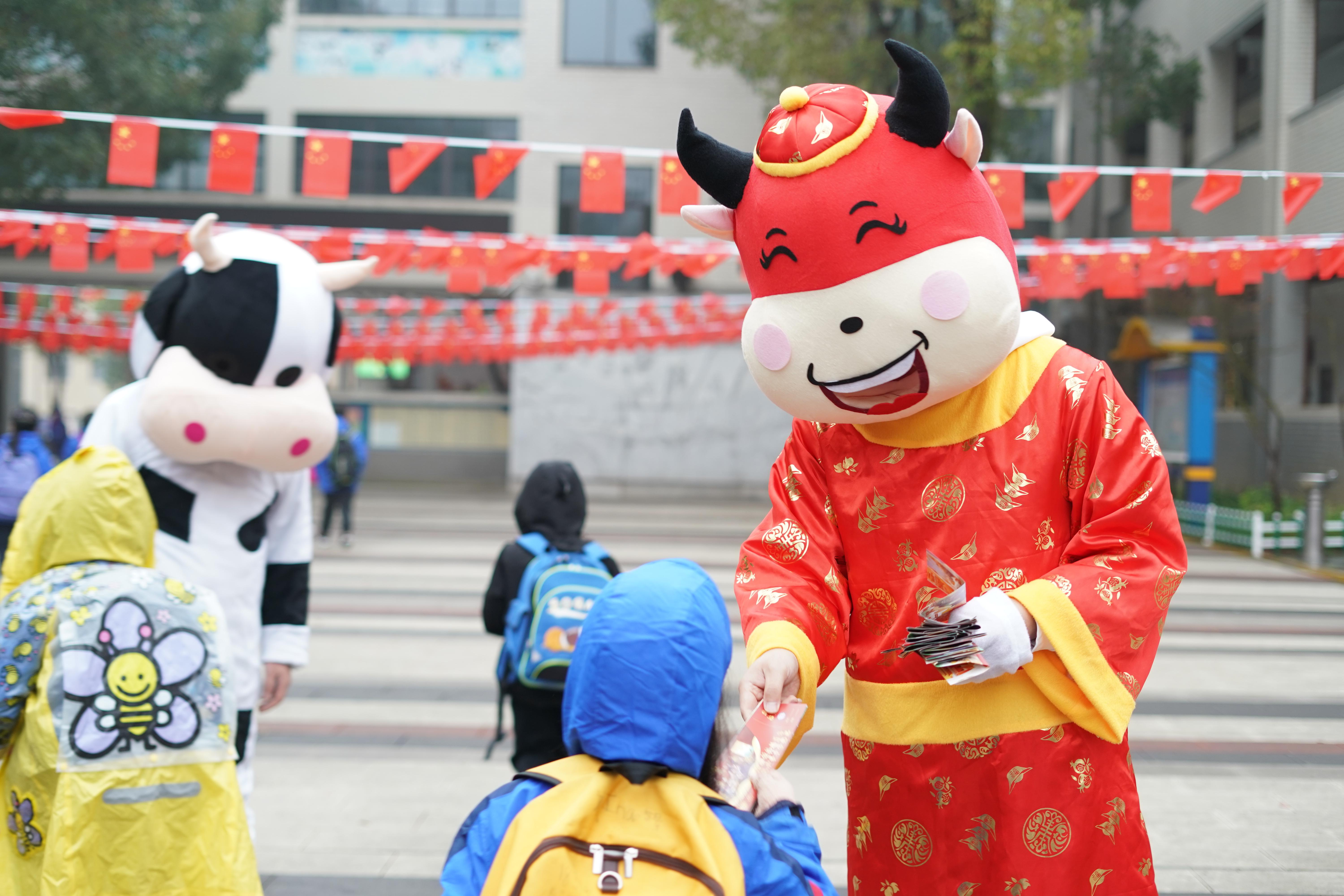 在江西省万载县康乐街道中心小学,学生们集体展示亲手写的毛笔字迎接新学期;在山东省济南市舜耕小学的门口,三位老师扮成三头小牛,代表“最美中国年”“红色中国年”和“喜庆中国年”,在校门口迎接学生们的归来;在广东省广州市天河区珠江新城猎德幼儿园,精彩的龙狮表演引来现场阵阵喝彩……