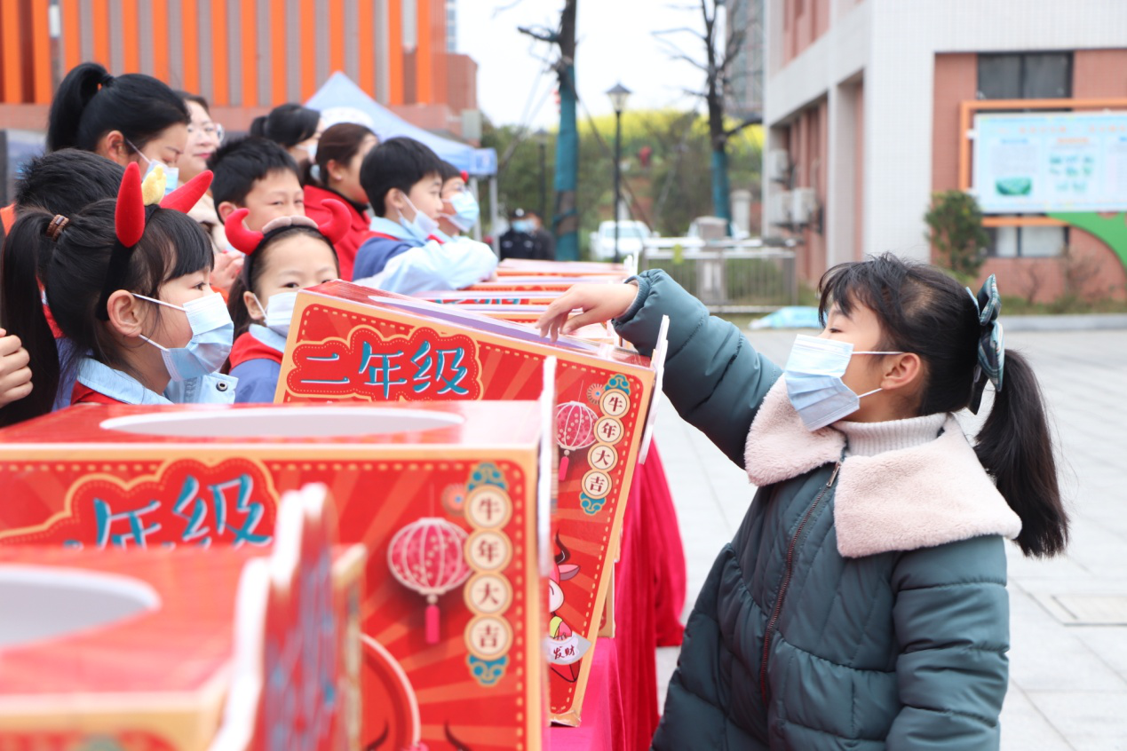 “2021年,希望家人、老师、同学们都健健康康,大家都像牛一样强壮!一起把病毒赶跑!”小学生罗婧漾手握一张新年心愿卡、踮起脚投进了心愿箱里。