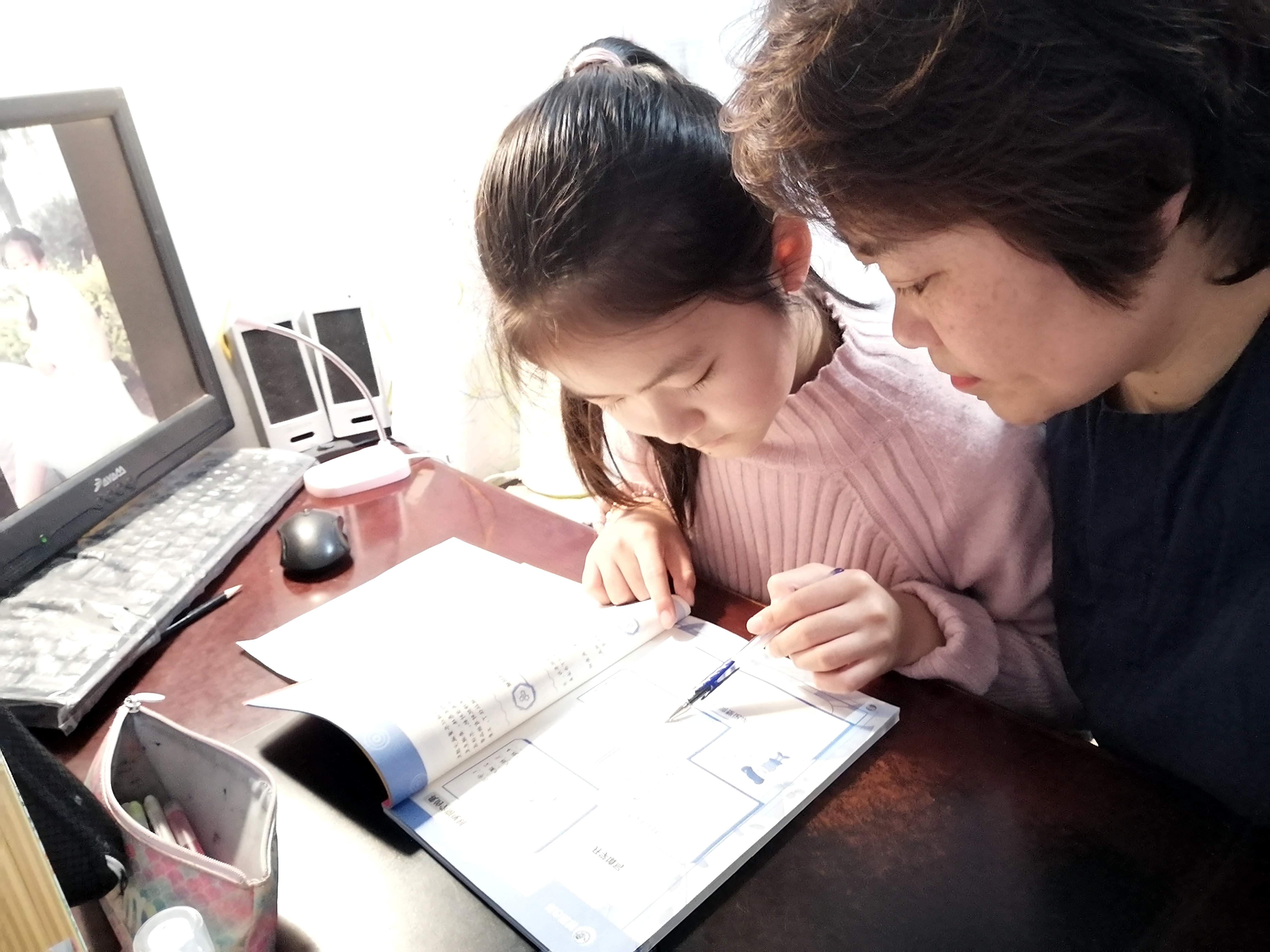 辽宁省锦州市古塔区保安第二小学五年级(4)班学生董泽林正和家长一起对寒假作业进行查缺补漏。(辽宁省锦州市古塔区保安第二小学供图)