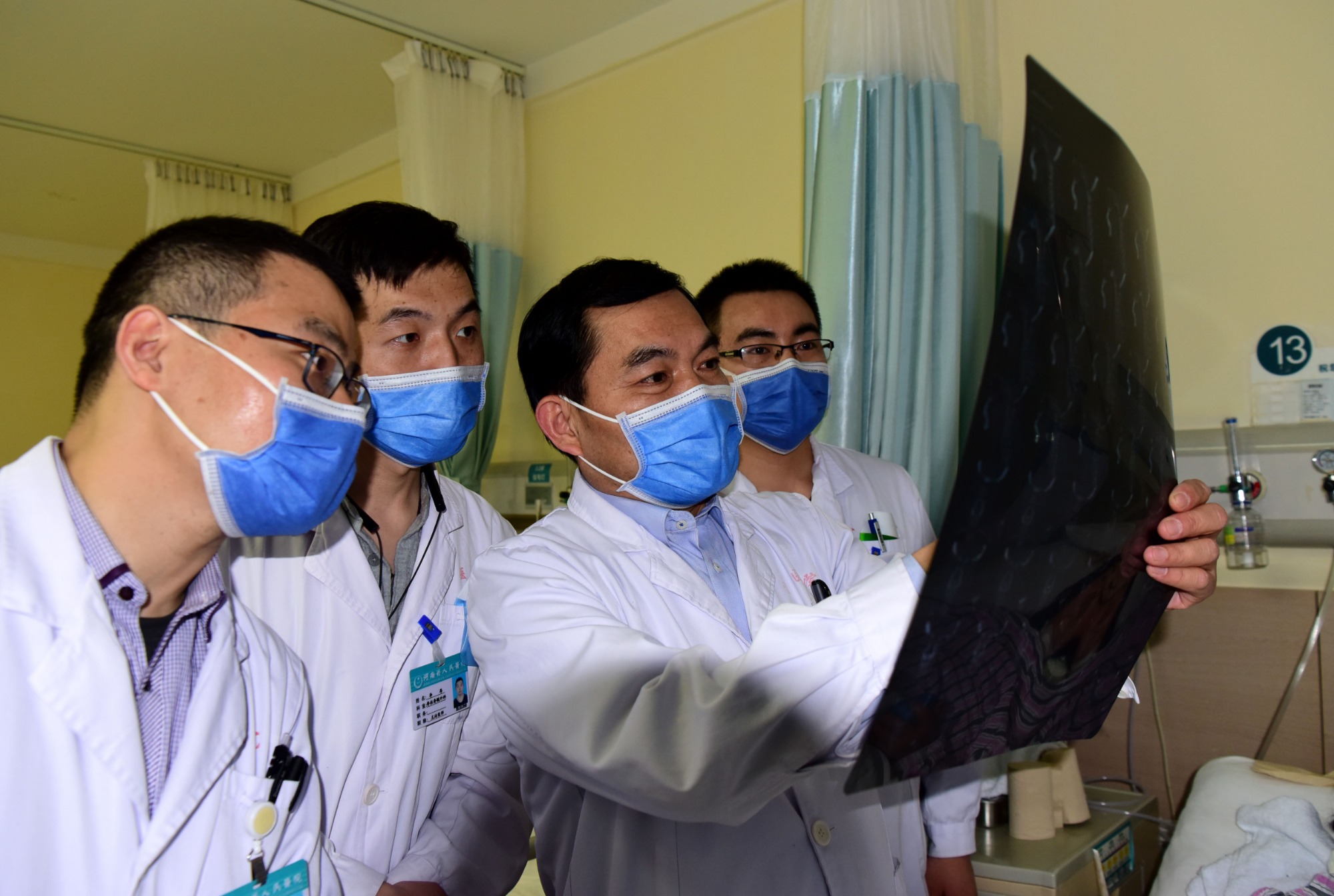 ↑2月24日,河南省人民医院脊柱脊髓外科主任高延征(左三)在病房会诊。新华社记者 朱祥 摄