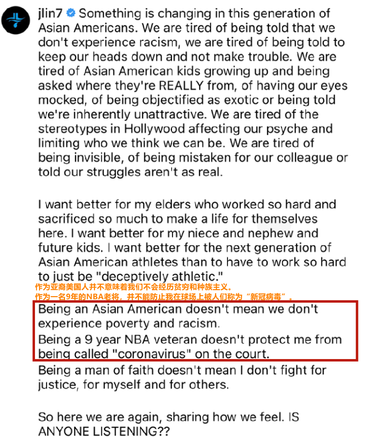 林书豪此次“突然”发声,与近期美国针对亚裔歧视行为和仇恨犯罪事件数量持续上升有关。