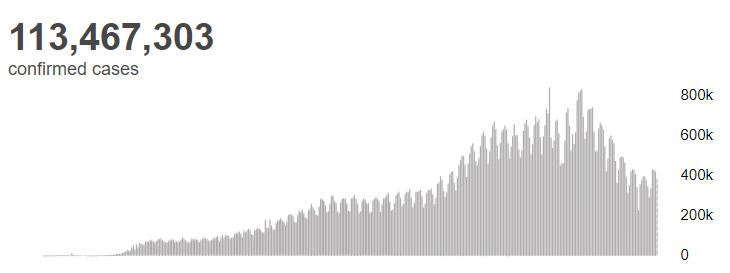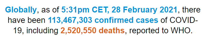 根据世卫组织最新实时统计数据,截至欧洲中部时间2月28日17时31分(北京时间3月1日0时31分),全球累计新冠肺炎确诊病例113467303例,累计死亡病例2520550例。28日全球新冠肺炎确诊病例新增384956例,死亡病例新增8230例。(总台记者 朱赫)