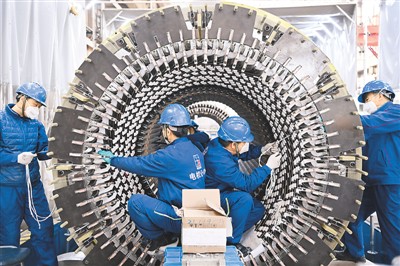 近日,哈电集团哈尔滨电机厂有限责任公司节后全面复工,在严格开展疫情防控工作的同时,加紧生产,保障重点项目产品完成进度。图为生产车间内工人在进行生产作业。新华社记者 王建威摄