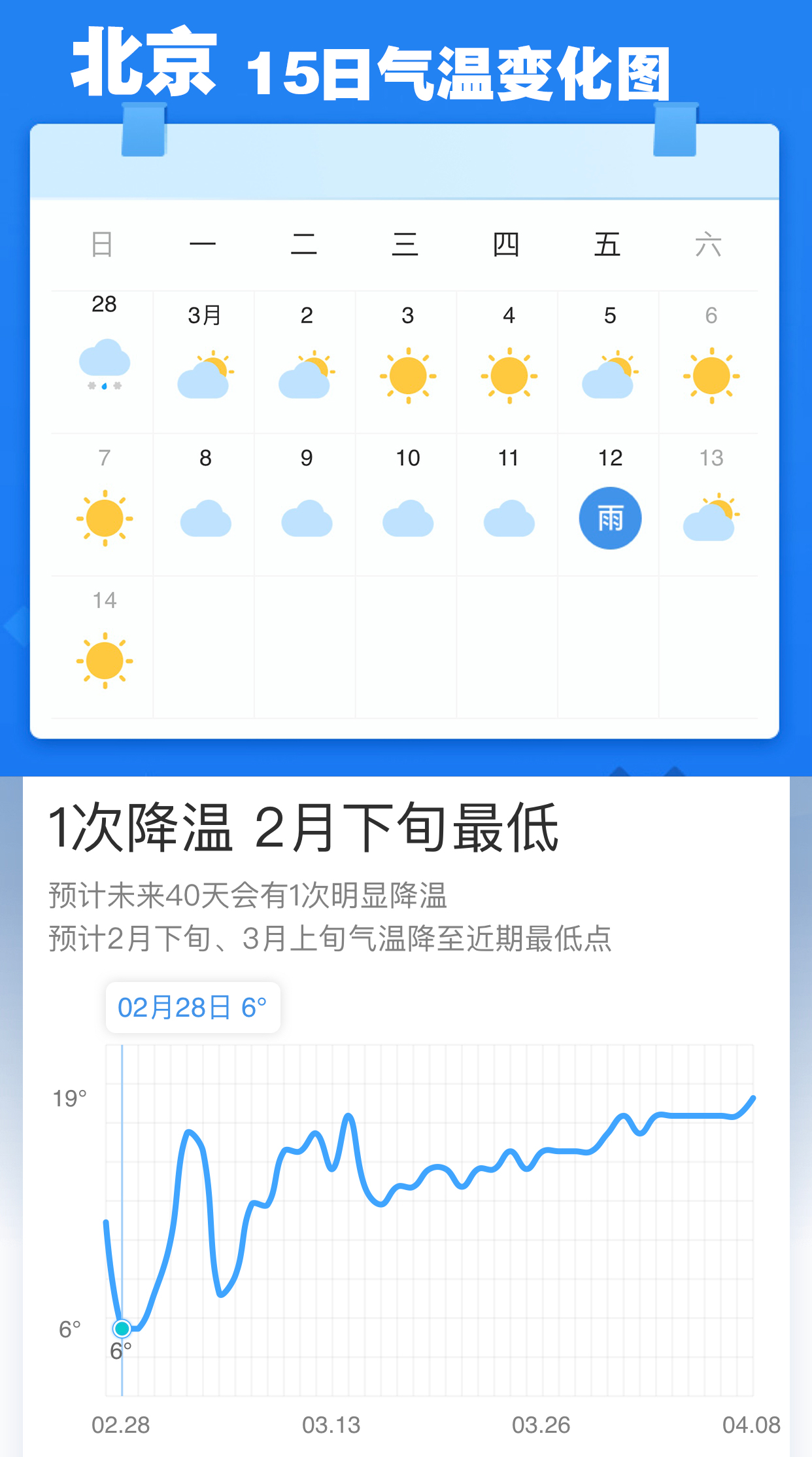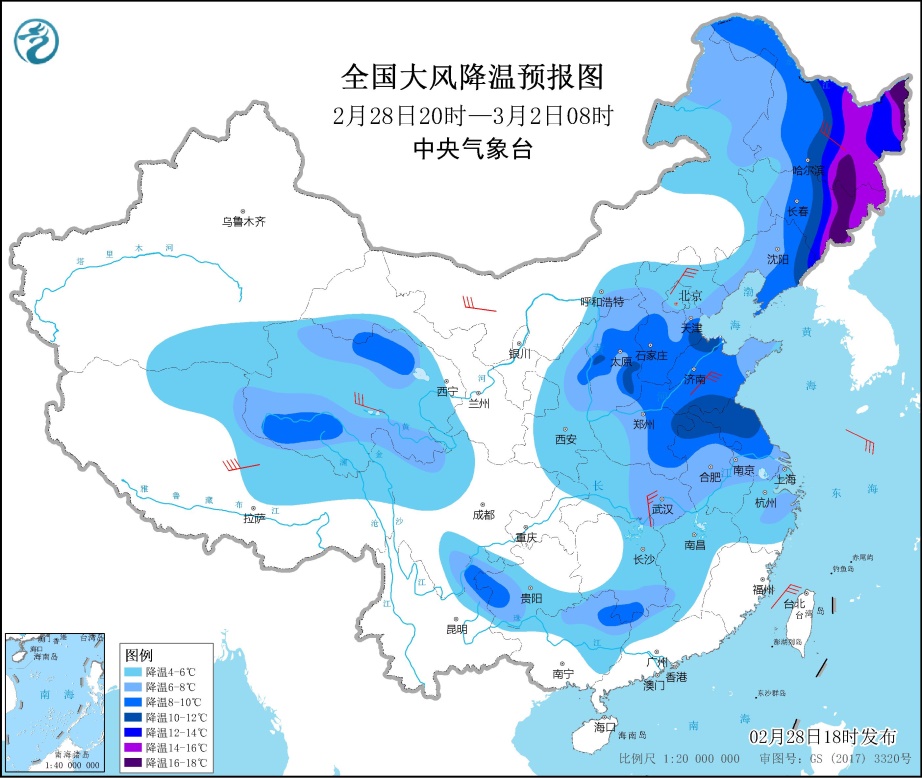 2月28日至3月2日,受东移南下冷空气影响,长江中下游以北部分地区有4~6级风,阵风7~8级;气温下降4~8℃,内蒙古东南部、黑龙江中东部、吉林大部、辽宁中部、山东西部、河南东北部等地降温10~14℃,局地可达14℃以上。