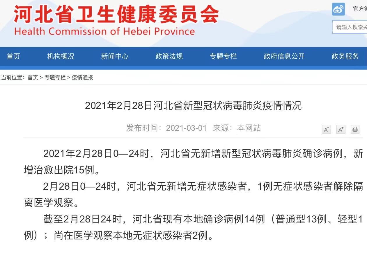 2021年2月28日0—24时,河北省无新增新型冠状病毒肺炎确诊病例,新增治愈出院15例。