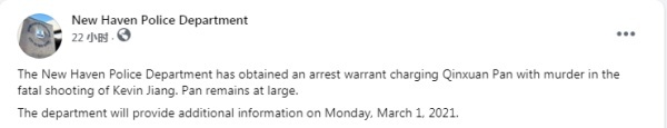 据《海峡时报》2月28日报道,纽黑文市警察局27日在脸书上发布消息称,警方已获得了对潘勤轩的逮捕令,而目前潘勤轩仍逍遥法外。3月1日,警方将提供案件相关的更多信息。