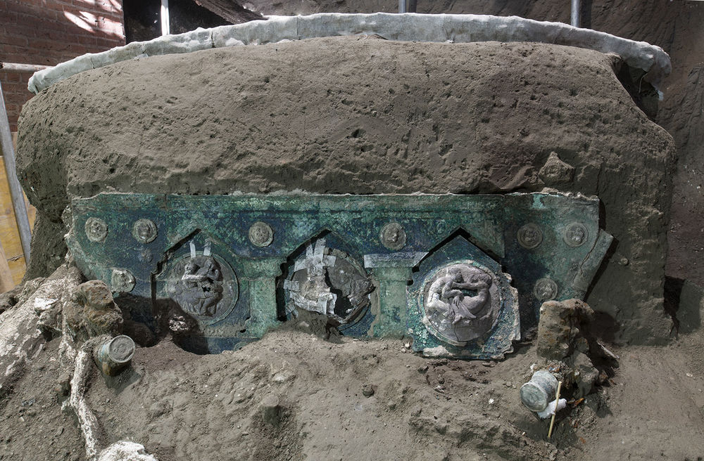 庞贝考古公园发布声明说,这驾马车出土时“几乎完好无损”,细节清晰可见,包括铁构件、漂亮的青铜和锡制装饰品、矿化木质遗迹以及绳索和鲜花饰品等有机物留下的印迹。“这是一项非同寻常的发现……就出色的保存状态而言,迄今为止在意大利无与伦比。”