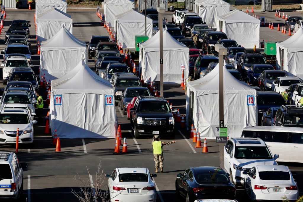 2月22日,民众驾车来到美国加州大学洛杉矶分校一处疫苗中心准备接种新冠疫苗。(新华社发)