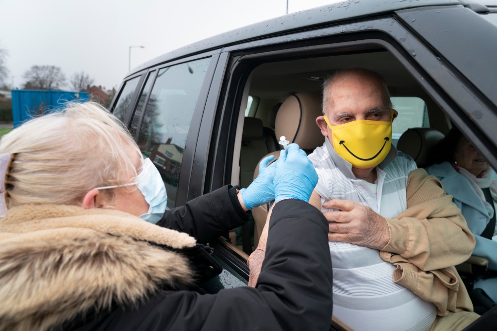 1月7日,在英国大曼彻斯特郡海德,一名男子坐在车内接种新冠疫苗。(新华社发,乔恩·休珀摄)
