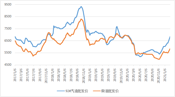 国内汽柴油批发价格周度均价走势图(单位:元/吨)