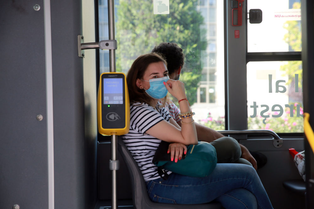 2020年8月1日,在罗马尼亚首都布加勒斯特,市民佩戴口罩乘坐公交车。(新华社发,彼得雷斯库摄)