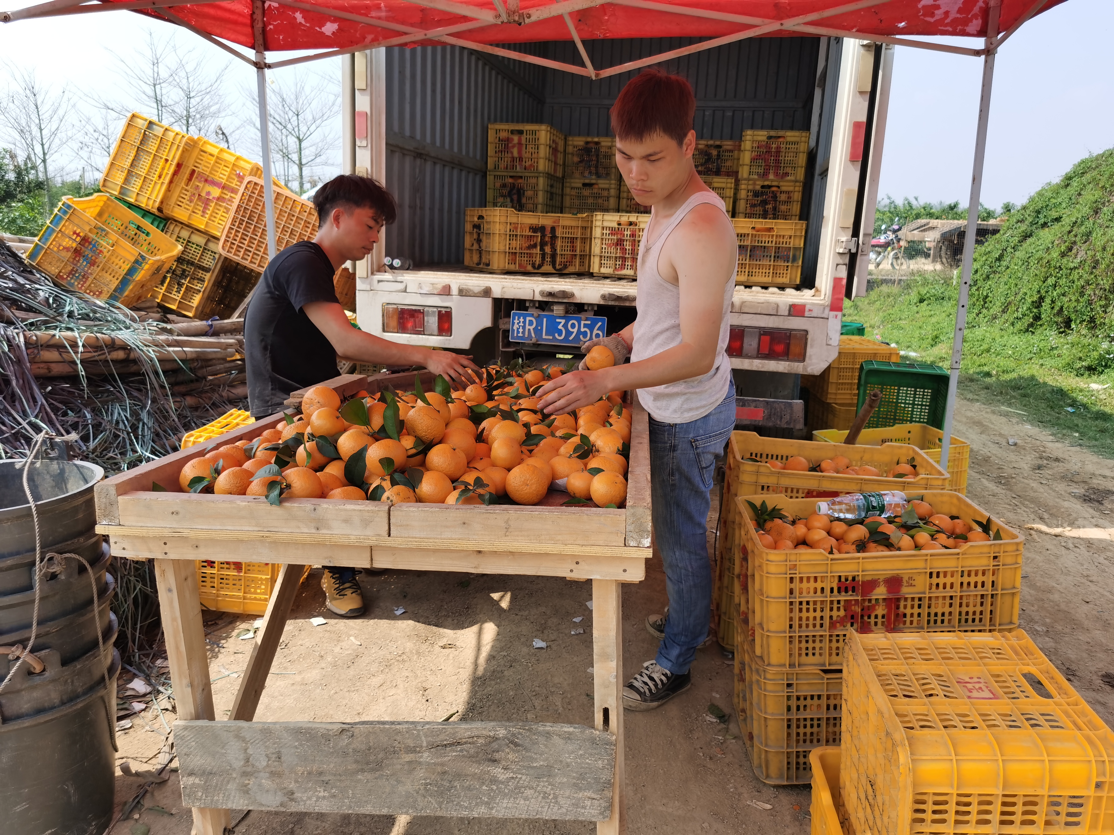 在桂平市南木镇沿江村辉峻家庭农场,村民将刚摘的沃柑分拣装箱