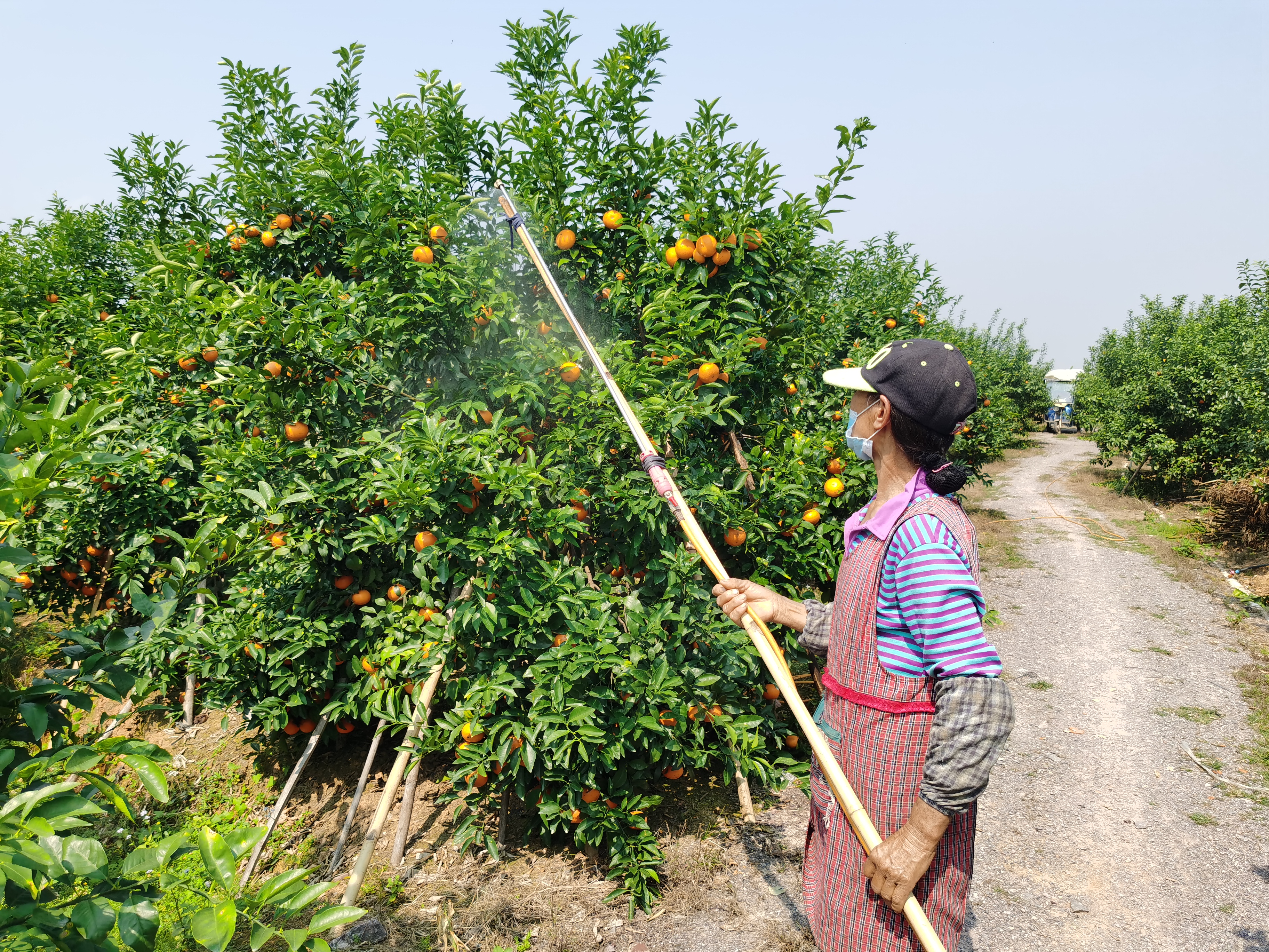 在桂平市南木镇沿江村辉峻家庭农场,60岁的村民黎秀兰正在给沃柑喷施叶面肥