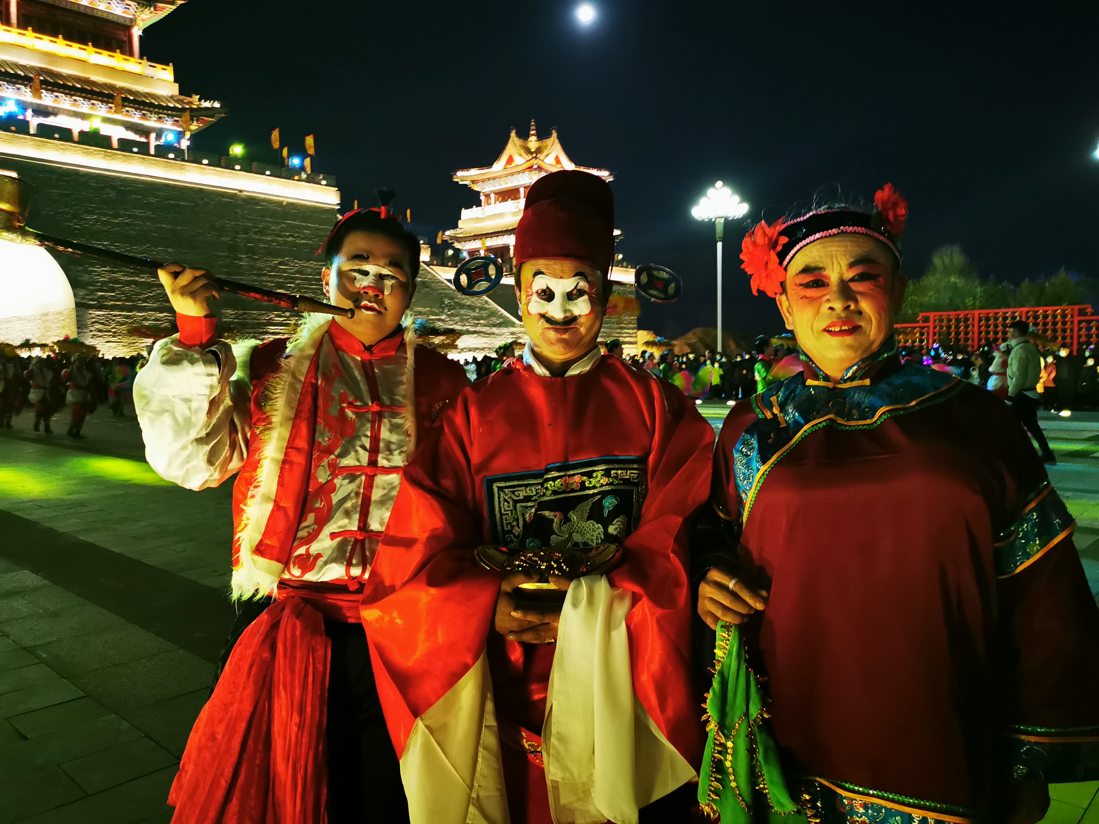 头戴乌纱帽,一身大红袍,脸中央一块白色油彩——元宵节当天,“丑县官”目光如炬,在震天响的唢呐和锣鼓声中手捧金元宝,同秧歌队“媒婆”“骑驴小媳妇”等一道,给明代古城墙下围观拍摄的百姓憨态可掬地拜了个晚年。