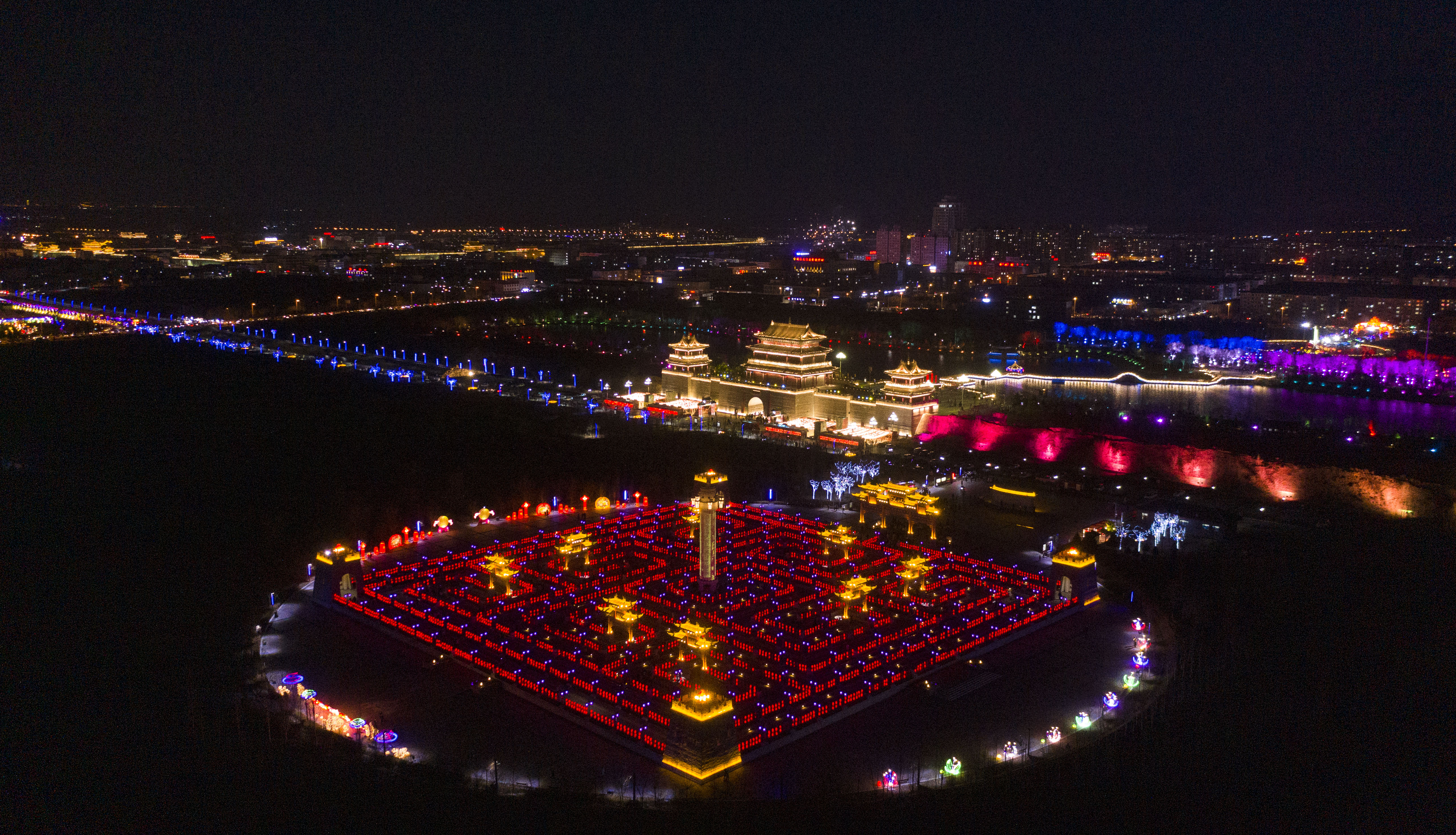 元宵节当晚,宁夏盐池县九曲民俗文化园和长城关流光溢彩。 新华社记者冯开华摄