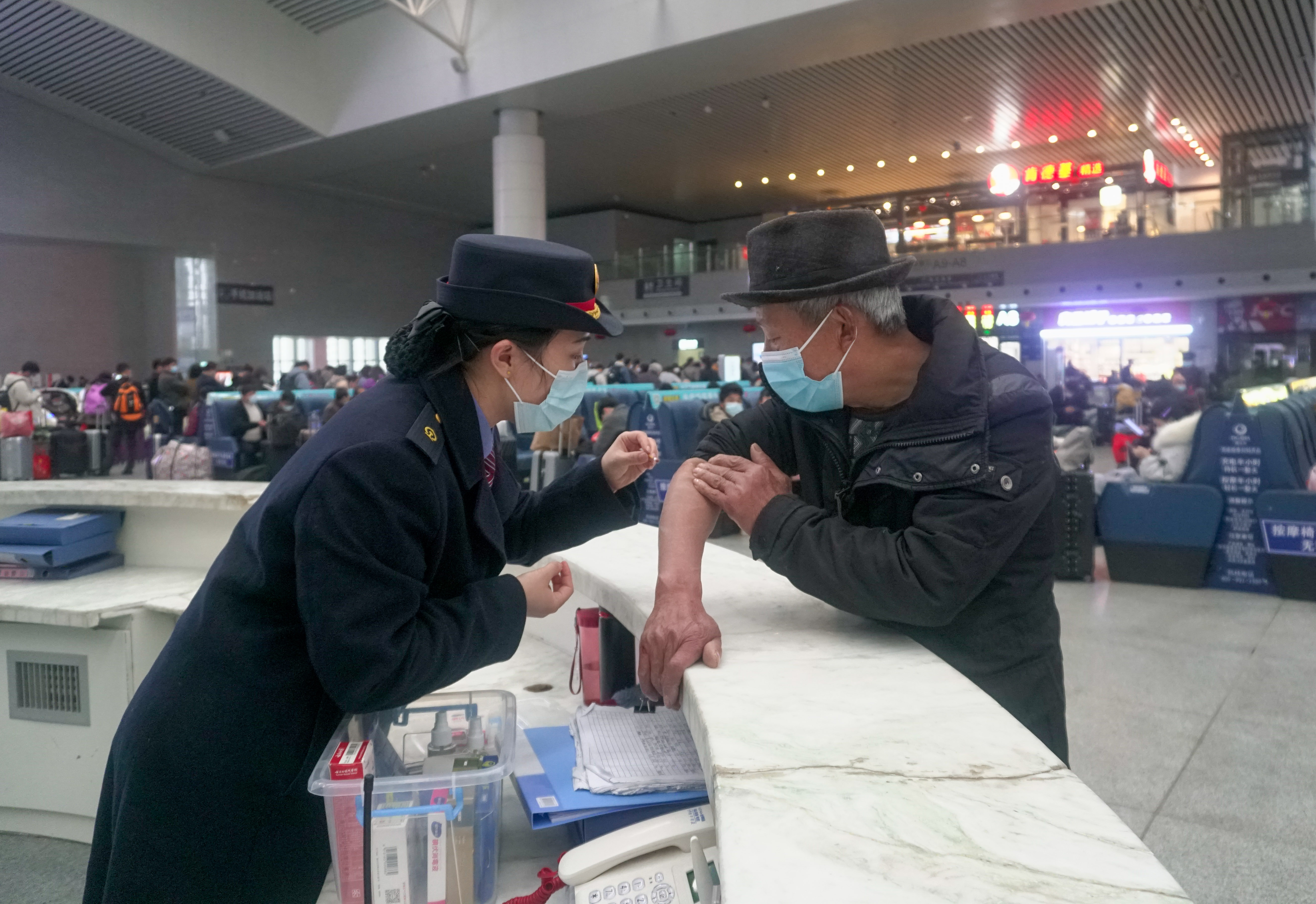 一名旅客胳膊不慎擦伤,刘洋正在用碘伏为他擦拭消毒。新华社记者 郭杰文 摄