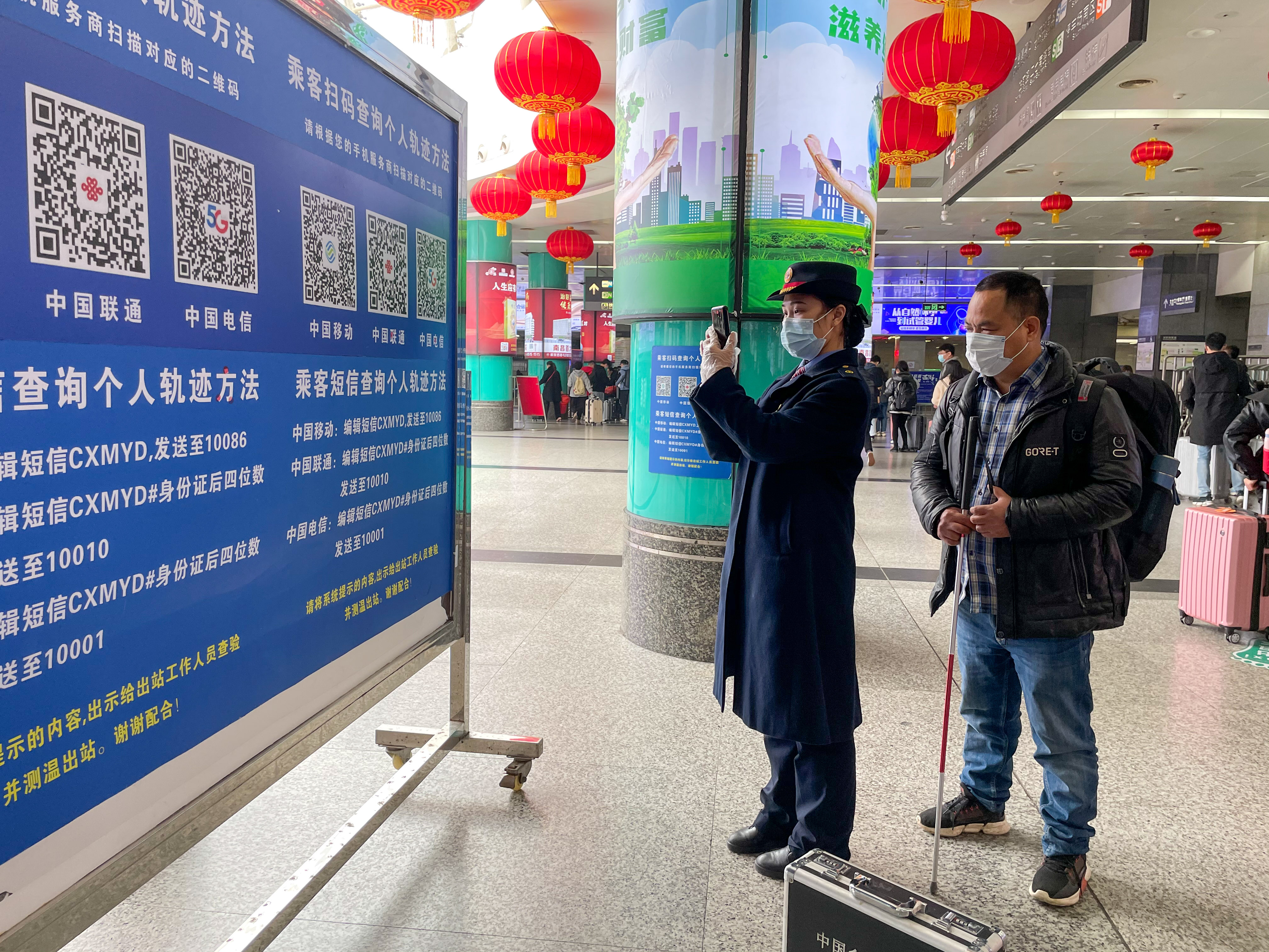 南昌站“红土情”服务台客运员刘洋正在帮一位盲人旅客扫行程码准备出站。新华社记者 郭杰文 摄