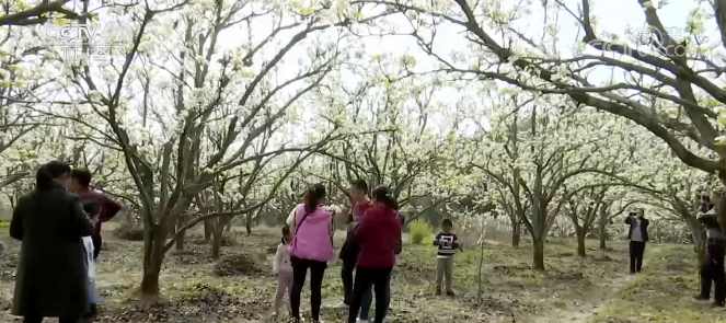 游客漫步梨园,放松心情,愉悦心智,或按下手中的快门,记录下眼中的美景;或靠近娇洁的花瓣,吸吮春天的气息。