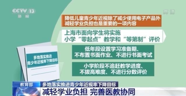 降低儿童青少年近视除了减少使用电子产品外,减轻学业负担也是重要的一项内容,上海市面向学生将实施小学“零起点”教学和“等第制”评价,低年段设置学习准备期、不布置书面作业、不进行书面考试,小学阶段不追赶教学进度、不拔高难度、不进行分数评价。如果是在线学习,北京市则要求教师不得超时录制网课,小学阶段每课时不超过25分钟,中学阶段每课时不超过35分钟。