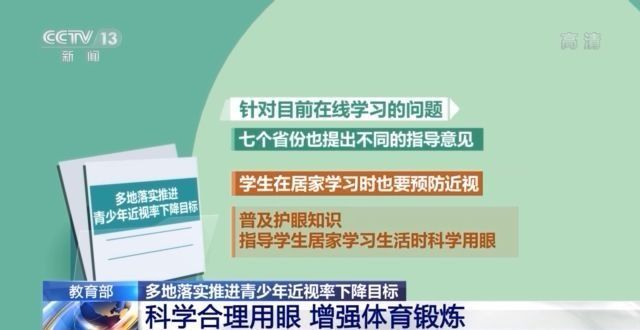 记者从教育部了解到,为保护学生视力,目前甘肃、山西、江苏、浙江、天津、北京、上海等地将“实现地方儿童青少年近视率下降目标”作为主要工作项目,把降低儿童青少年近视率作为教育综合改革的重点任务。