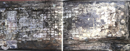 西汉海昏侯刘贺墓的棺椁中虽然没有玉衣,但却在主棺底部发现了平铺的一领包金丝缕琉璃席。这领琉璃席底下垫着100枚马蹄金,上面的长方形琉璃片用包金丝缕连缀起来,长约1.8米,宽约0.65米,琉璃片整齐排列为32排,每排12片,共计384片。琉璃席周边还包裹着闪闪发亮的云母片。刘贺的遗体就安祥地平躺在这领包金丝缕琉璃席上。琉璃在当时属于玉石的范畴,因此琉璃席也可以称为玉席(图1),在丧葬用玉中尚属首次发现。