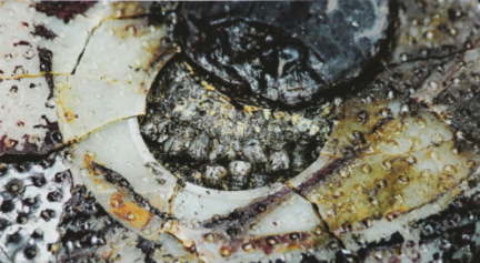刘贺的遗体上虽然没有玉面罩,但在他头骨的面部位置上却发现了一件精美的玉璧。这件用上等和田白玉制成的玉璧直径约14.12厘米,孔径约5.17厘米,厚约0.52~0.57厘米。两面均砣刻规整饱满的谷纹,局部有灰白色沁,出土时已断裂多处(图2)。值得注意的是这件玉璧的大小正好覆盖了刘贺的整个面部,而且从玉璧的内环处人们还惊奇地发现了刘贺遗体尚存的两排洁白的牙齿。