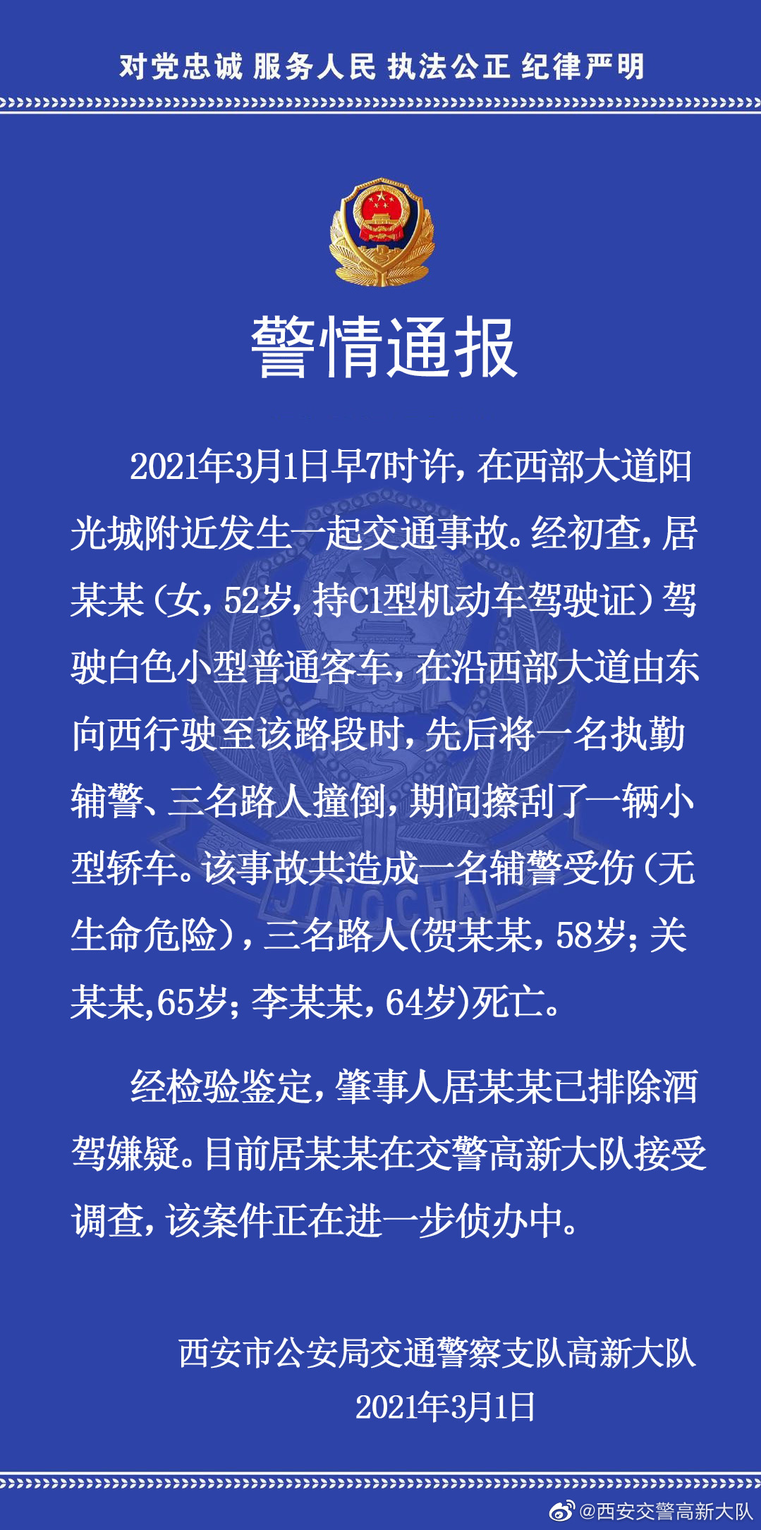 陕西西安一女子驾车致3人死亡 一名辅警受伤