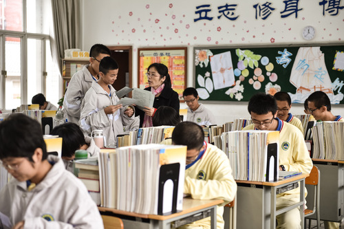 2015年12月14日,在广东顺德碧桂园总部设立的国华纪念中学,学生向老师请教问题。2002年,杨国强出资2.6亿元创办了国华纪念中学,免费招收家庭贫困、成绩优秀的学生,提供助学金直至学生完成大学、硕士、博士所有阶段的学业。新华社记者毛思倩摄
