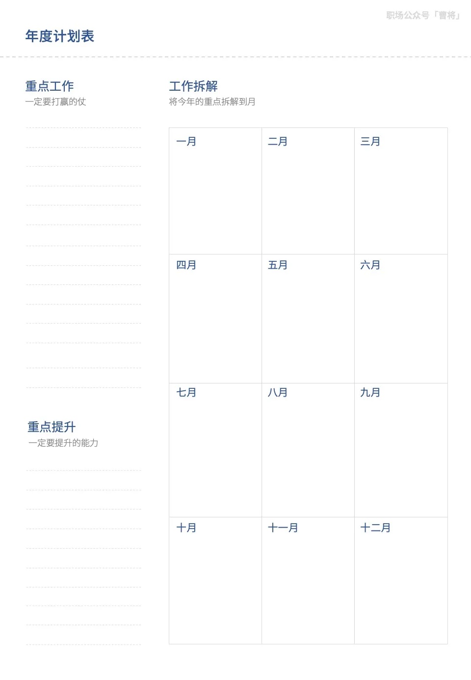 明确了「为了工作要做什么」和「为了自己的提升要做什么」后,接下来就需要把它们拆解到月份里。