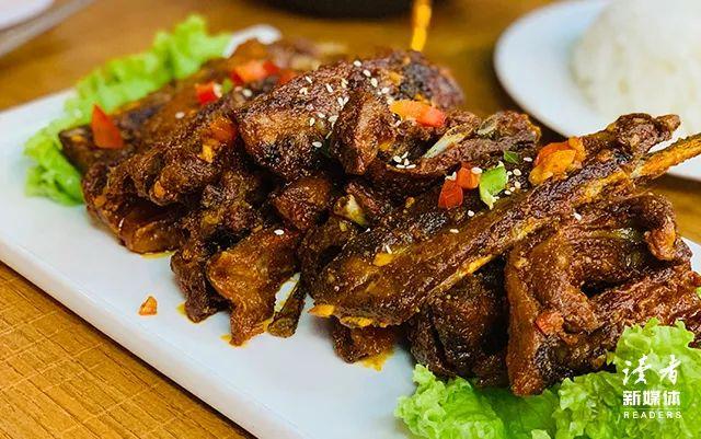 雅喀穆一看不落忍,就想这个羊骨能不能做得更好吃一点,于是就把羊骨剁成小块儿,先卤出来,然后在锅里面放辣椒、葱段和白酒,再继续翻炒,直到把骨头里的水分炒干了,香料入了味。