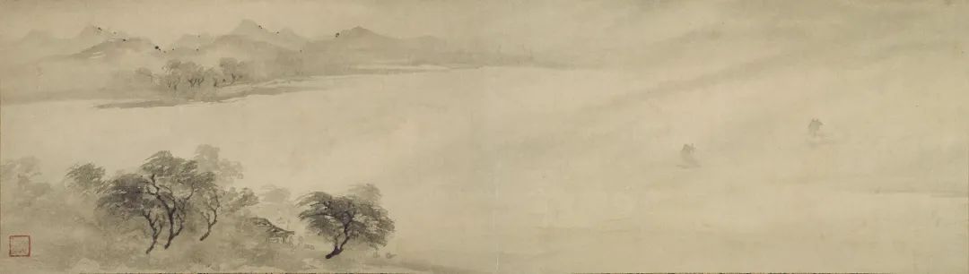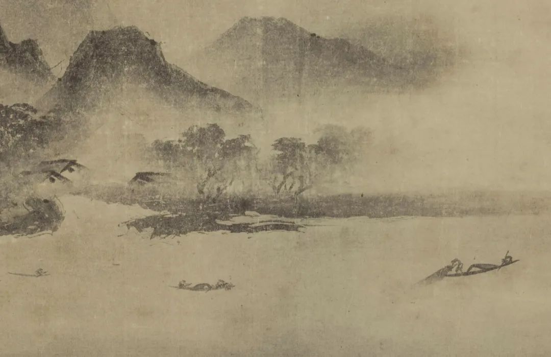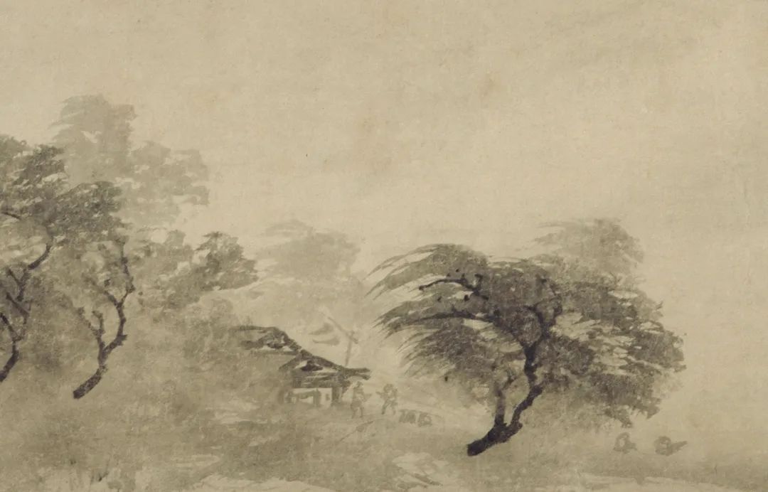 牧溪笔下的《潇湘八景图》与前人不同。他的“远浦归帆”里,没有沈括文字中的渔歌阵阵,而是一场急风暴雨:摇曳的树,鼓鼓的帆,示意着风的力道;江上水汽弥漫,雾蒙蒙,雨蒙蒙。风雨正时,大抵如此。