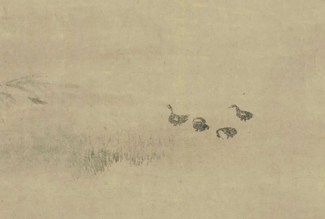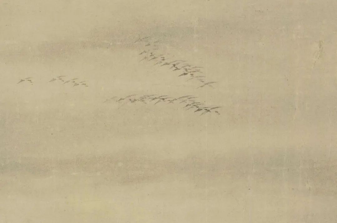远方的雁群,依稀可见。仔细观看,才发现近处还有四羽大雁,虽是寥寥数笔,雁却形态各异,清晰生动。