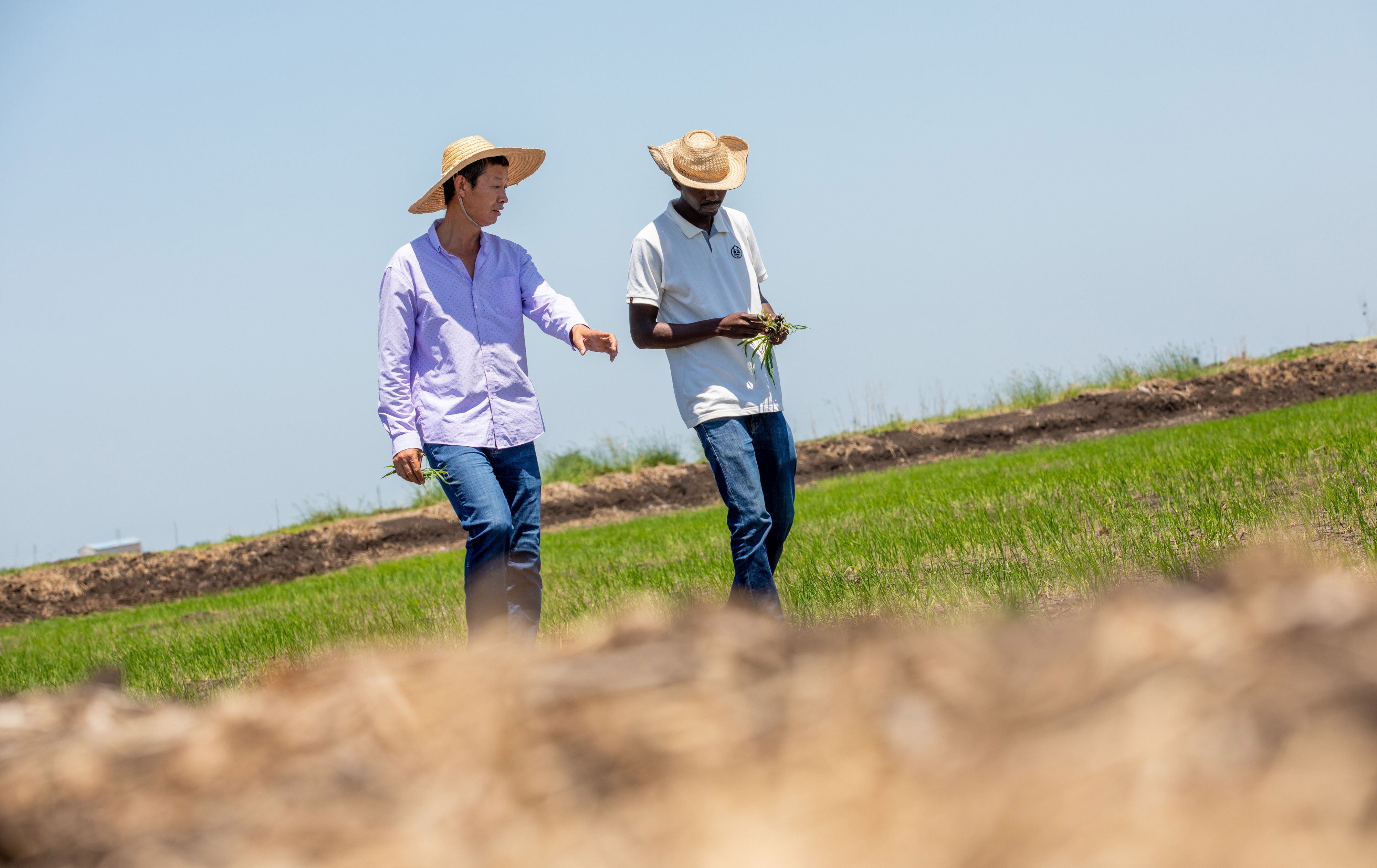 图为2019年11月28日,在莫桑比克万宝莫桑农业园,中国农业专家(左)和当地农业技术人员巡查水稻田。新华社记者张宇摄
