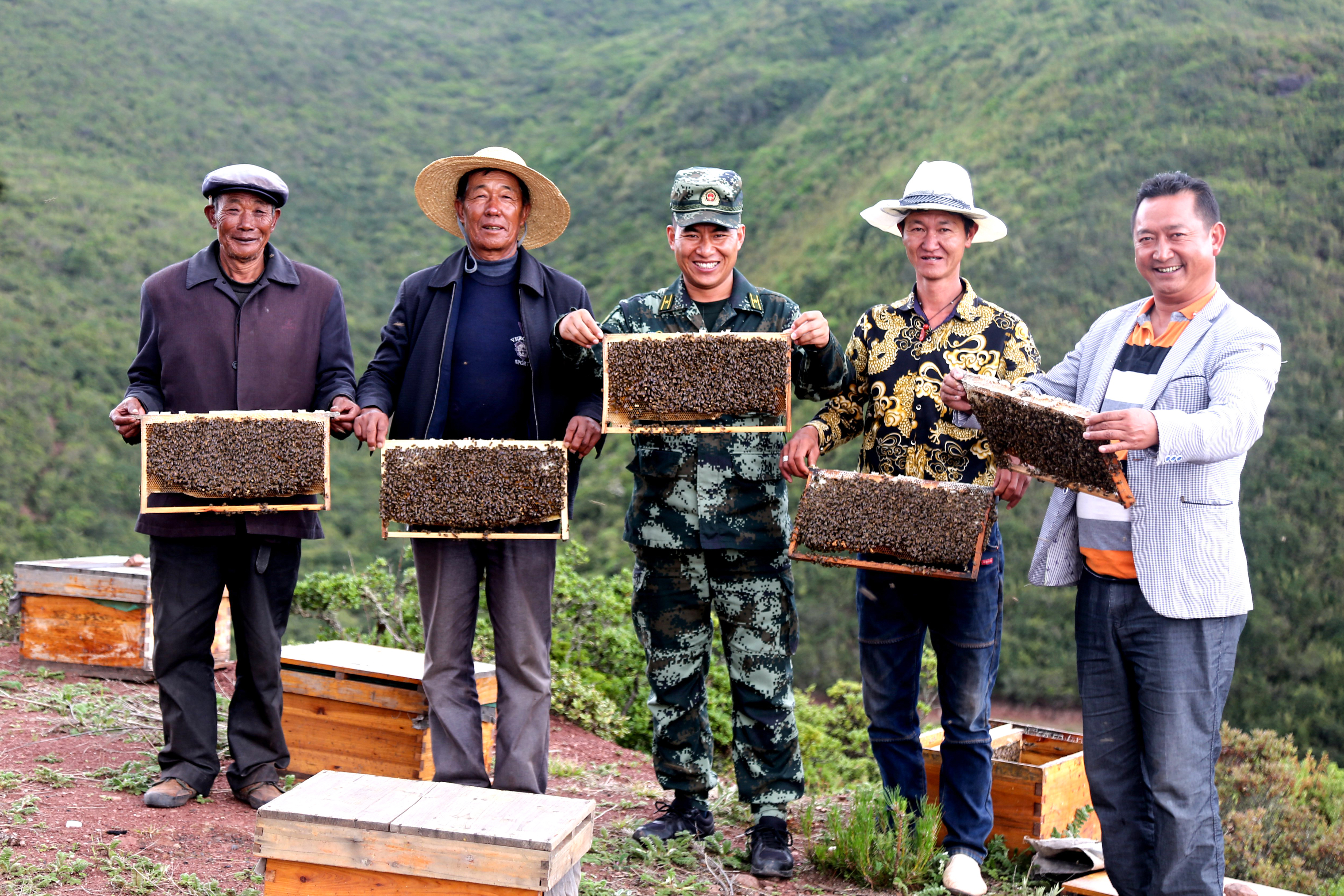 图为2019年6月12日,武警四川总队凉山支队精准帮扶昭觉县梭梭拉打村发展养蜂产业,总队驻村扶贫干部布哈(中)和村民一同展示丰收成果。新华社发(杨剑 摄)