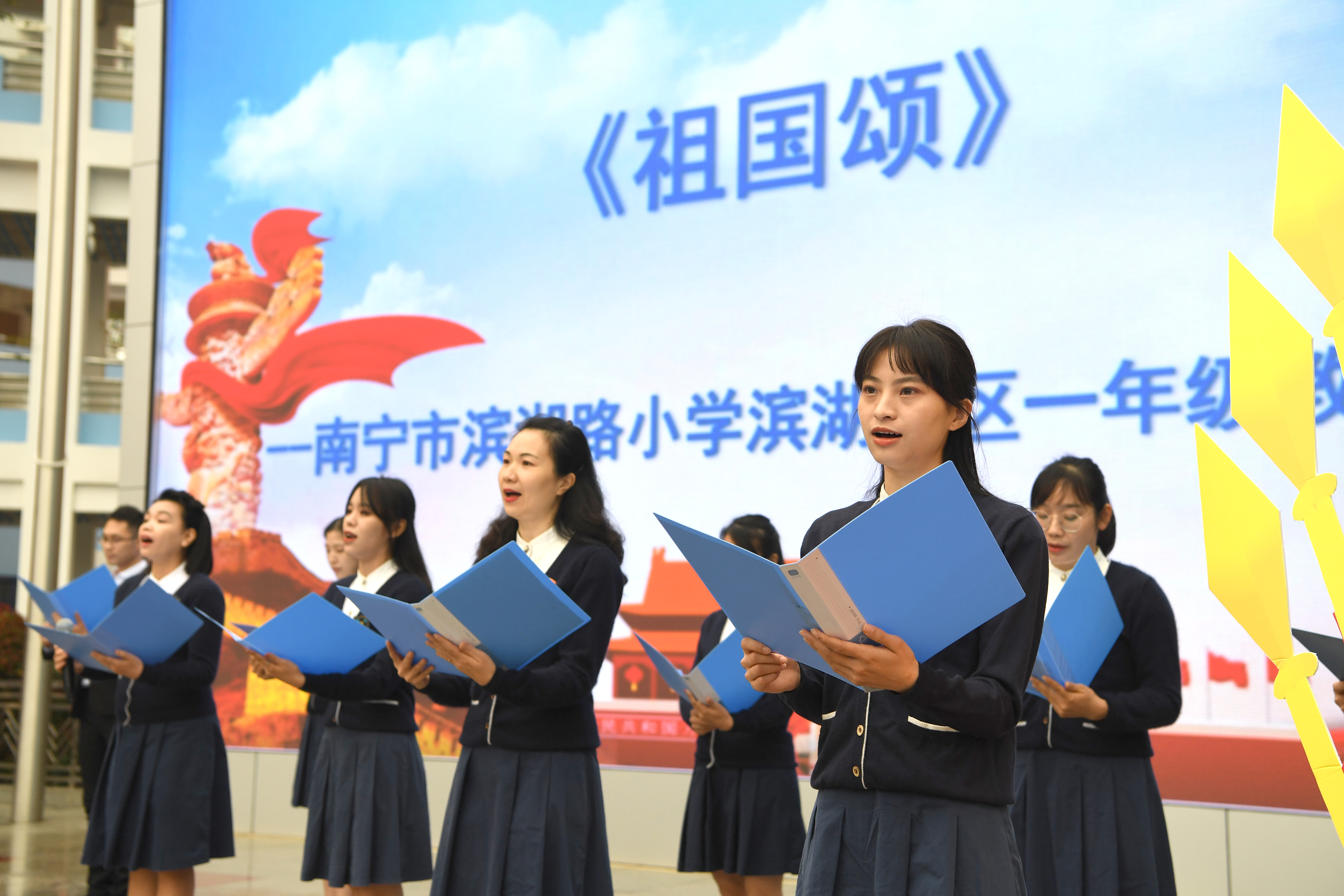3月1日,广西南宁市滨湖路小学老师在开学仪式上朗诵诗歌《祖国颂》。新华社记者 周华 摄