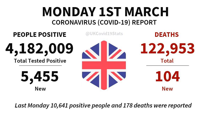 据英国卫生保障部公布,截止当地时间3月1日,英国新增新冠肺炎确诊病例5455例,累计确诊4182099例,新增死亡病例104例,死亡总计122953例。