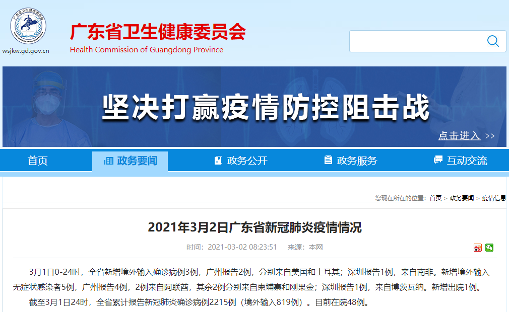 截至3月1日24时,广东省累计报告新冠肺炎确诊病例2215例(境外输入819例)。目前在院48例。