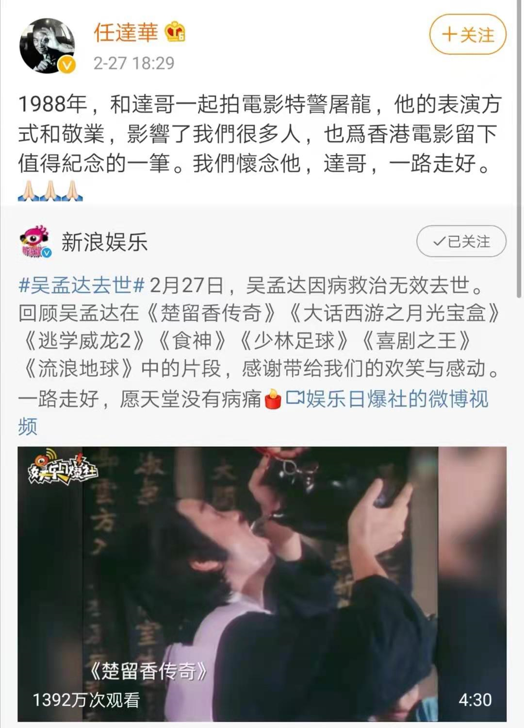 北京时间2月27日,香港知名喜剧演员吴孟达因病在香港病逝,享年70岁。