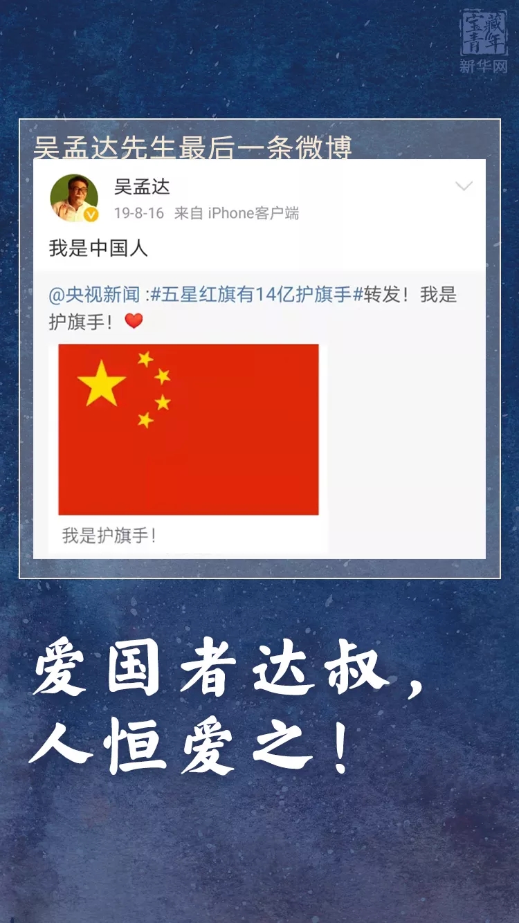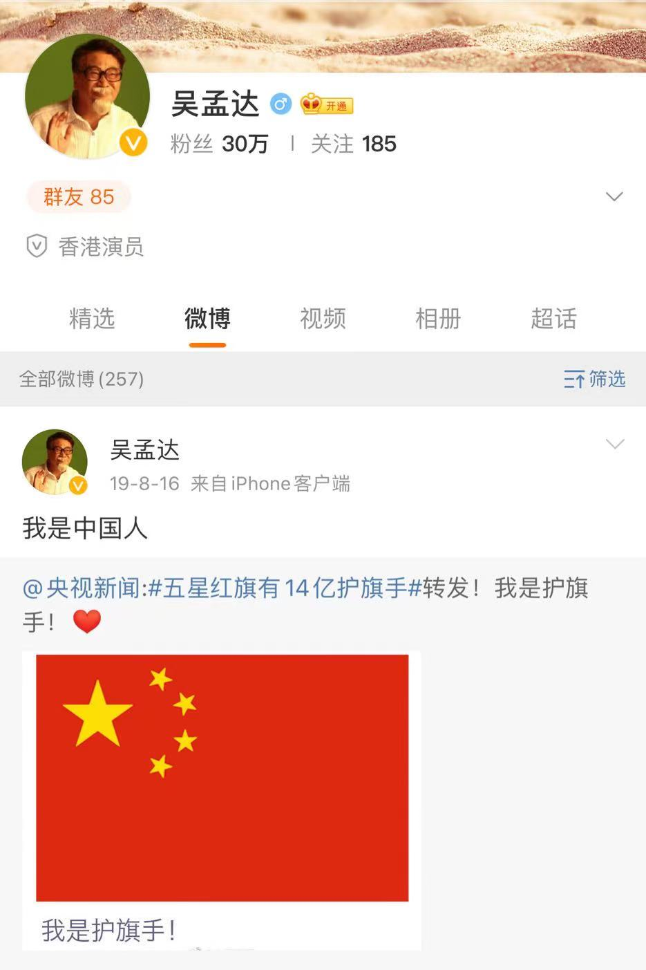 值得注意的是,吴孟达最后一条微博停留在2019年8月16日,写着,“我是中国人”。