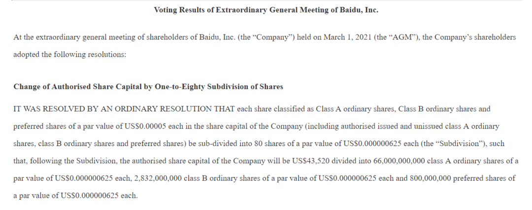 公告显示,拆分后,公司的法定股本将为43520美元,分为660亿股每股面值0.000000625美元的A类普通股,28.32亿股每股面值0.000000625美元的B类普通股和8亿股每股面值0.000000625美元的优先股。对于百度ADS的持有人,每股ADS所代表的公司权益的百分比不会发生改变。
