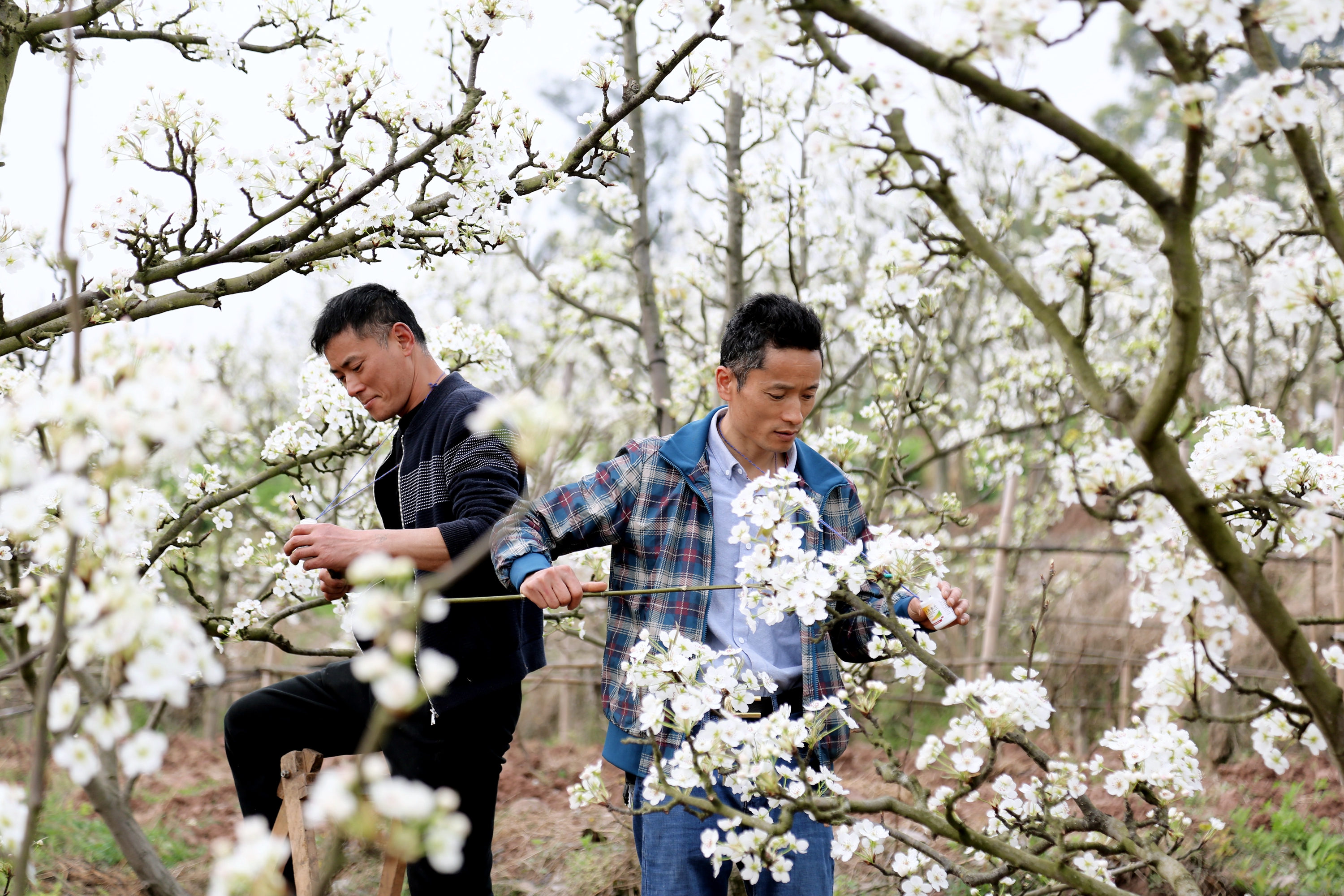 在四川仁寿县曹家镇东联村,村民正进行梨花人工授粉。仁寿县委宣传部供图