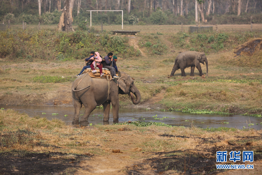 2月中旬,尼泊尔南部的奇特旺国家森林公园,当地游客正骑上大象准备开始丛林探险。