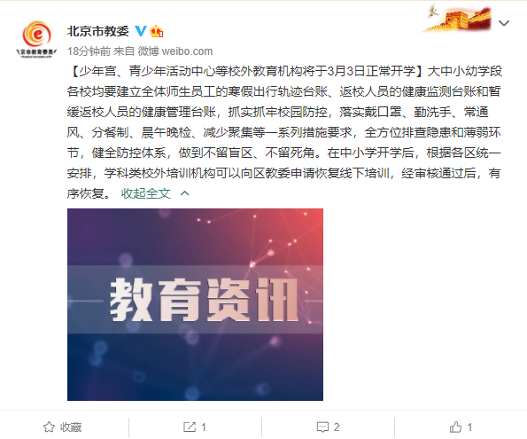 北京市教育委员会官方微博“北京市教委”发布消息,大中小幼学段各校均要建立全体师生员工的寒假出行轨迹台账、返校人员的健康监测台账和暂缓返校人员的健康管理台账,抓实抓牢校园防控,落实戴口罩、勤洗手、常通风、分餐制、晨午晚检、减少聚集等一系列措施要求,全方位排查隐患和薄弱环节,健全防控体系,做到不留盲区、不留死角。