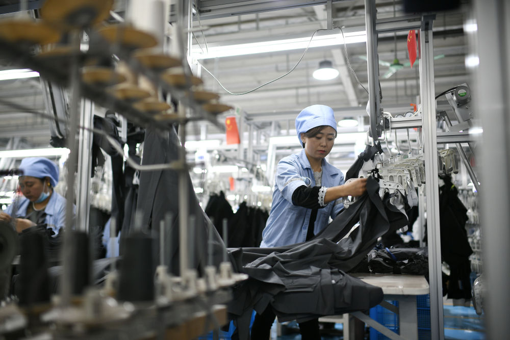 2月24日,宁夏同心县中核(宁夏)同心防护科技有限公司扶贫车间的女工在加工服装。(新华社记者王鹏摄)