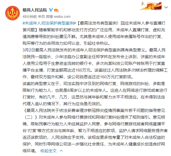 3月2日最高人民法院发布的未成年人司法保护典型案例具有典型意义。最高人民法院民一庭庭长、少年法庭办公室副主任郑学林在发布会上讲到,涉案的未成年人使用父母用于生意资金流转的银行卡,多次向某科技公司账户转账用于打赏直播平台主播,打赏金额高达近160万元。该案经过人民法院多次辩法析理的调解工作,最终双方庭外和解,该公司自愿返还近160万元打赏款项。